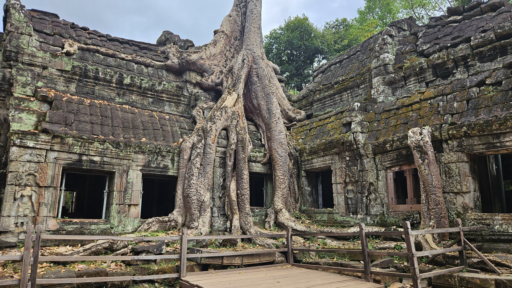 Mit einer 3h Busfahrt reisten wir weiter nach Kompong Thom wo es weitere sehr beeindruckende alte Religiöse Stätten gibt. Savarman I machte 616 Jhr. Isanapura zur Hauptstadt seines Königreiches Chenla. Wir genossen es weit und breit die einzigen Besucher auf diesem riesengrossen Tempelgelände zu sein. Die alten Gebäude, die von Bäumen überbewachsenen Ruinen, die pfeifenden Vögel, das riesige vor der Hitze schützende Blätterdach dies alles hatten wir ganz für uns allein.
