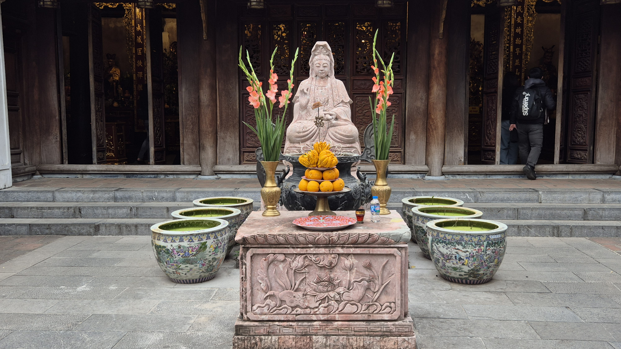 Am letzten Tag bestiegen wir irgendeine Strassenbus und landeten am Truc Bach Lake, assen Tacos, flanierten neben einer Wassergolfanlage und lauschigen Strassencafés entlang, besuchten eine 11 Jh. alte Tempelanlage und erreichten so wieder das Stadtzentrum. An jeder Ecke waren aufgebrezelte Chinesen bei ihrem Fotoshooting fürs Chinese New Year zu sehen.