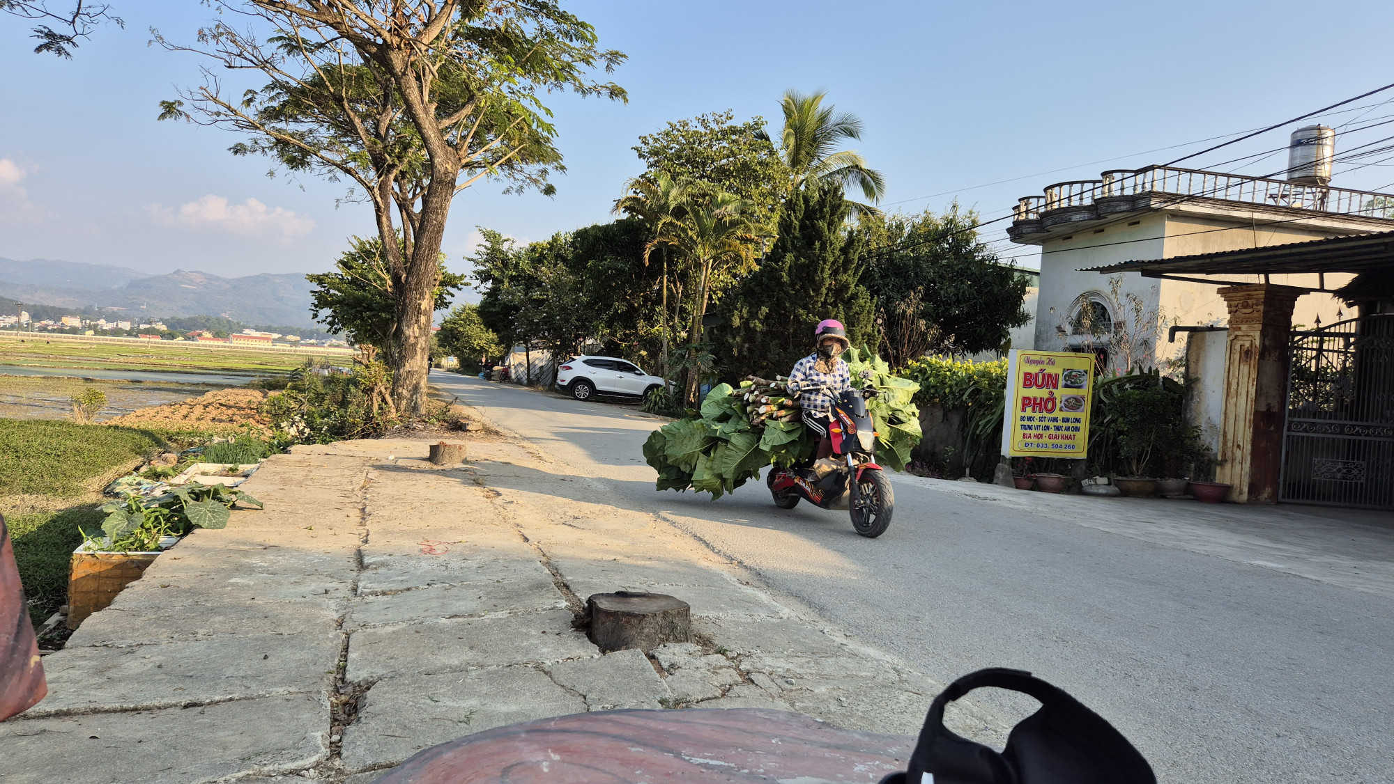 Eine 6h Busfahrt brachte uns am 12.1. nach Dien Bien Phu. Wieder ein sehr voll gestopfter Bus, nicht die bequemste Art zu reisen, leider aber die Einzige. Im Hotel An Loc hatten wir ein super sonniges Südzimmer mit Balkon gebucht. Dieses lag zwar mitten in der Stadt, aber im 4 Stock mit Blick über die Dächer kümmerte uns dies wenig. Nach nur 2 Nebeltagen, saugten wir die Sonnenwärme so richtig auf. In DBP assen wir Pizza, mieteten ein Moto erkundeten die Gegend, kauften beim Früchtehändler geschälte Früchte, assen im Hotelzimmer Frühstück und trockneten dank Sonnenfenstern unsere Wäsche. Als einzige Touristen weit und breit genossen wir einfach den Alltag, den Tag, das jetzt, das Sein und überhaupt das Leben.